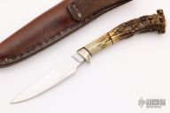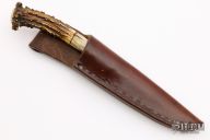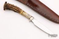 This knife by JB Fuchs features a mirror finished blade with .148" blade stock and .555" blade depth, hidden tang construction. The handle has a nickel silver guard a crown stag grip with red spacers. Comes with a brown leather sheath. Has a couple light scratches, otherwise excellent condition.