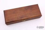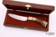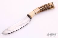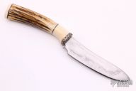This knife by JB Fuchs features a hand rub satin finished blade with hamon, .109" blade stock and .715" blade depth, hidden tang construction. The handle has a fileworked Damascus guard, stag grip with bronze and mammoth ivory spacers, mammoth ivory butt. Comes with original wooden box. Excellent condition.
