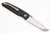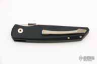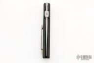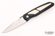This 8852 Harkins ATAC by Pro-Tech Knives was designed by Jeff Harkins. The auto fire feature is achieved by depressing the lower corner of the first (closest to front of the handle) micarta inlays. Manual opening is equally effective, and with dual thumbstuds can be accomplished with either hand. Closes via the linerlock. Has a black aluminum handle, ivory paper micarta inlays and a black blade. Has a bronzed tip up orange peel finished titanium clip with hidden screws. Comes with original box and papers. Excellent Condition.