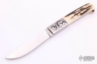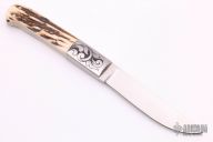 This Bird and Trout by RB Johnson features a hand rub satin finished blade with .114" blade stock and .751" blade depth, full tang construction. The handle has engraved and dovetailed stainless steel bolsters and stag scales. Has some light scratches, otherwise excellent condition.
