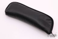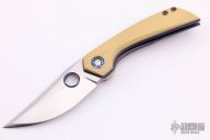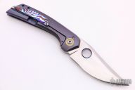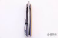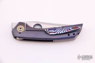 This Prospect Micro #1 by Tuff Knives features a hand rub satin finished blade with a false top edge, notched front flipper, and timascus thumbhole. The handle has a Westinghouse paper micarta scale, orange peel finished and anodized titanium frame, timascus and Westinghouse micarta pivot collars, timascus backspacer and tip up clip with hidden screws. Excellent fit and finish. Dead center blade seating, smooth action and nice detent. Includes C.O.A. dated 2019. Comes with zippered case.