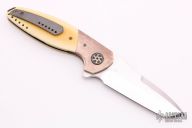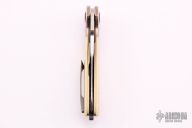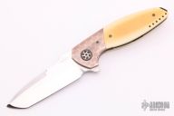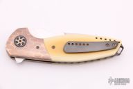 This Cayman by Peter Carey features a hand rub satin finished blade with notched thumbrest and flipper. The handle has Honey Comb Super Conductor bolsters, Antique Westinghouse paper micarta scales, anodized and orange peel finished titanium liners, zirconium pivot collars, dragon spine backspacer, tip up clip, custom "saw" pivot. Rides on bearings, nice detent, lockup and blade seating. Comes with nylon zippered case. From the 2020 Friday Night Blade Affair. Has a few light scratches on the clip, otherwise excellent condition.