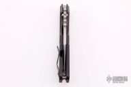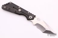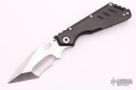 This Mick Strider custom SMF XL framelock folder features a satin nightmare ground tanto blade with stonewashed flats, notched thumbrest and thumbhole. The handle has a black titanium frame with a titanium clip, tip up carry. Jimping on blade spine. Includes Hinderer "Lock Bar Stabilizer" for maximum reverse lock retention. Nice lockup, detent, and blade seating. Excellent work. Signed on underside of tang. Comes with zippered case. Excellent condition.