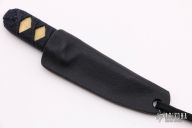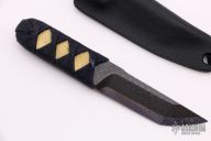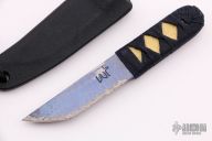 This Tanto by Warren Thomas features a chisel ground, fingerprint anodized titanium blade with carbon fiber laminate and a carbidized edge. 0.208" blade stock and .738" blade depth. The handle is comprised of a Japanese style wrap over ray skin. Includes kydex sheath. Excellent condition.