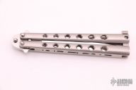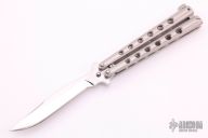 This Balisong from Roton Knives features a mirror polished blade. The handle is comprised of skeletonized integral stainless steel handle with machined T latch on pommel. Has some light scratches, otherwise Excellent condition. Comes with a velcro belt sheath.