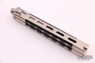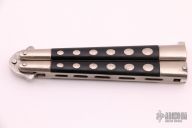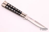 This International Series Weehawk Balisong has a satin finished stainless steel blade with false top edge (marked 1985). Handle is steel with black plastic inlays. Comes with nylon sheath. Has some light scratches, otherwise excellent condition.