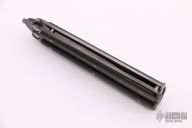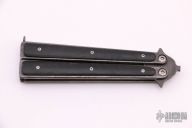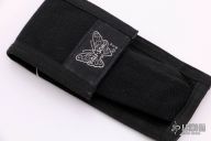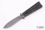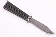 This Balisong by Les Voorhies features a Damascus blade and Damascus handles with carbon fiber scales and a Damascus latch at the butt. Comes with a velcro case. Has a few light scratches and a little patina, otherwise good condition.