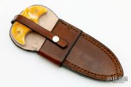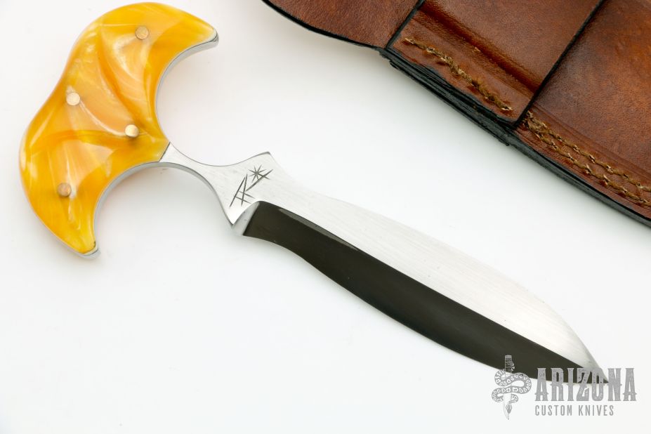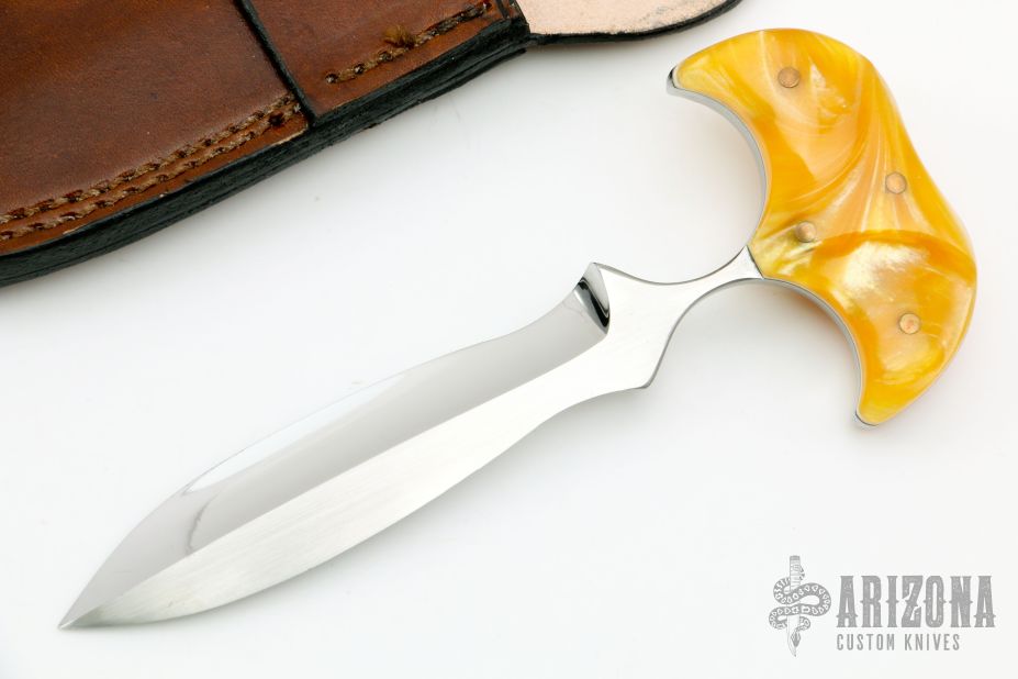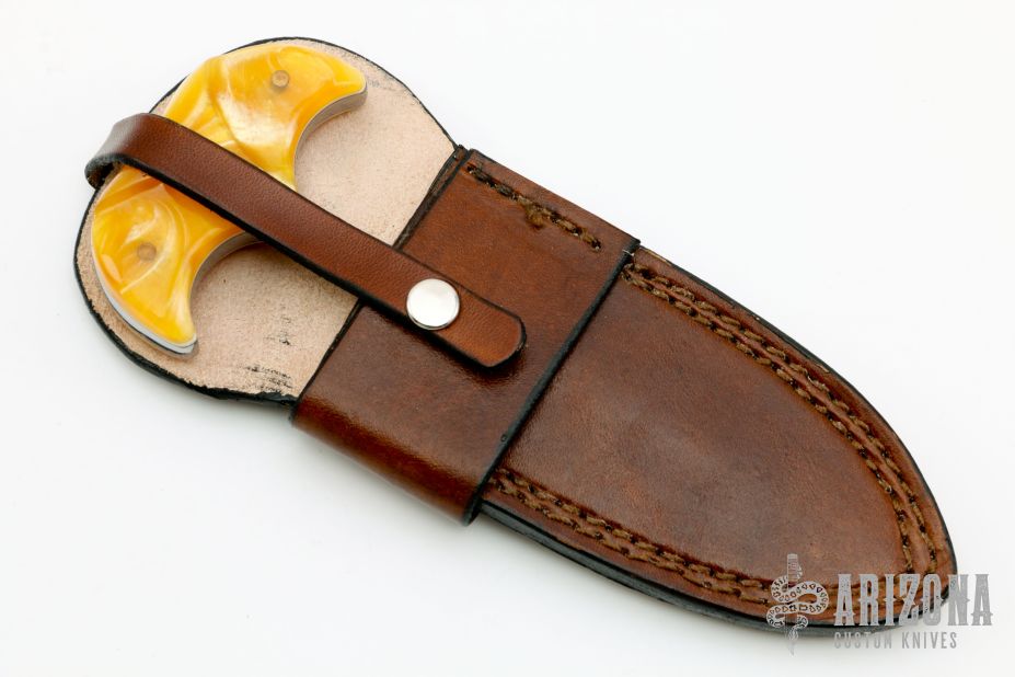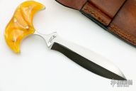 Extremely unique blade grind similar to the "Besh Wedge".  Deeply hollow ground and highly polished on one edge of each opposing side making for a hollow ground chisel grind.  When viewed from the tip of the blade back to the handle it resembles a Besh Wedge where the tip is at an angle to the rest of the blade. Rare and beautiful Chinese luminescent powder swirled resin handles. Comes with a custom brown leather sheath. Excellent condition.
