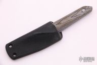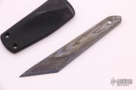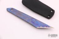 This ThumbTAC by Warren Thomas features a chisel ground, fingerprint anodized titanium blade with blue denim micarta laminate and a carbidized edge. 0.339" blade stock and .725" blade depth. Includes kydex sheath. Excellent condition.