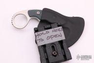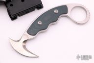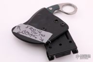 This Gitlin Karambit by Terry Guinn features a satin finished blade and tang with .168" blade stock and 2.096" blade depth/length, full tang construction. The handle has green G-10 scales and a ring at the butt with notched at the rear. Comes with a kydex sheath w/ TekLok. #031. Has a few light scratches, otherwise excellent condition.