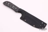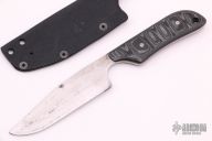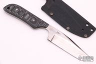 This Thin Bowie from Fred Perrin features a clip point chisel ground blade with swedge, visible temper line and notched thumbrest, .122" blade stock and 1.020" blade depth, full tang construction. The handle is comprised of black/grey G-10 scales with grooves. Lanyard holes at the butt. Includes kydex sheath. Has some scratches, otherwise good condition.
