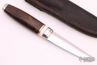 This knife by Marcus Doyle features a mirror polished blade with .166" blade stock and .827" blade depth, hidden tang construction. The handle has a nickel silver guard, african blackwood grip, red/nickel silver/tooth spacers. Comes with a brown leather sheath. New from maker.