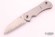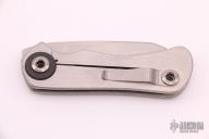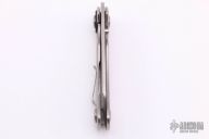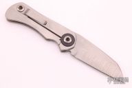 This framelock by Warren Thomas features a satin finished chisel ground wharncliffe blade with carbidized edge and single thumbstud. The handle has a satin finished titanium frame with matching tip up clip and a carbon fiber overtravel stop. Nice detent, lockup and blade seating. Excellent condition.