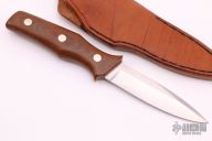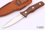 This Lightweight Hunter by Bill Reh features a satin finished spear point blade with .138" blade stock and .960" blade depth, mortise tang construction. The handle has vintage 1970s canvas micarta and nickel silver pins. Comes with a brown leather sheath. New from maker.