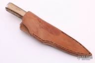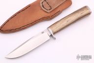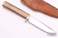 This Hunter by Bill Reh features a satin finished drop point blade with notched thumbrest, .172" blade stock and 1.018" blade depth, hidden tang construction. The handle has a stainless steel guard and butt with a fossil oosic grip. Comes with a brown leather sheath. New from maker.