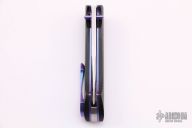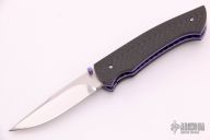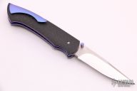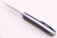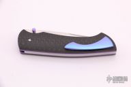 This Sparrowhawk Scale Release D/A Auto from William Tuch features a two-tone blade with dual anodized titanium thumbstuds. The handle features carbon fiber scales, anodized titanium liners with jeweled interiors, stainless steel backspacer, and tip up anodized titanium pocket clip with hidden screws. Nice detent, lockup and blade seating, strong action. Comes with SIG padded zippered case.  Excellent condition.