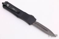 This Troodon by Microtech features a Damascus blade with a standard edges. The handle has a black aluminum frame, black ringed hardware and tip down black stainless steel clip. Dated 11/2020 and s/n 125. Includes the original box and papers. Excellent condition.