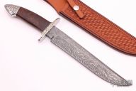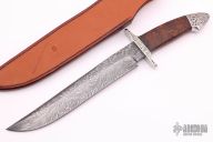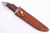 This Fighter by D.E Friedly features a Serpentine Feather Damascus blade with false top edge, .253" Blade Stock. 1.492" Blade Depth, hidden tang construction. The handle features an engraved stainless steel guard and butt cap with 24kt gold inlays done by Nathan Dickinson, presentation grade ironwood burl grip with black spacers. Includes a hand tooled brown leather sheath and COA dated February 22nd, 2017. Excellent Condition. Comes with a zippered case.