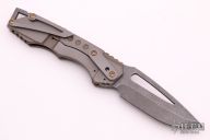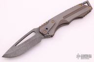 This Combat Folder #010 by Scorpion 6 Knives features an acid tumble finished blade with a thumbhole. The handle has an anodized and bead blasted titanium frame with a matching tip up clip, acid tumbled stainless steel backspacer. Nice detent, lockup and blade seating, rides on bearings. Excellent condition. Comes with original box and papers dated January 18th, 2021.