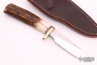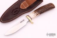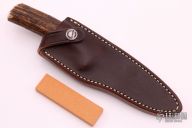 The Model 26 by Randall Made Knives is an excellent skinning and outdoors knife with drop point satin finished blade with .162" blade stock and .919" blade depth, hidden tang construction. The handle has a brass guard, stag grip and red/white/blue spacers. Comes with brown leather sheath and original paper wrapping. Excellent condition.