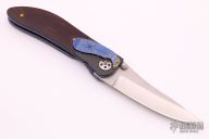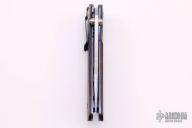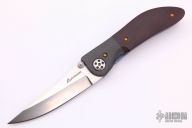 This knife by Allen Elishewitz features a tumble finished blade with dual thumbstuds. The handle has carbon fiber bolsters, maroon linen micarta scales, anodized titanium liners and tip down clip. Nice detent, lockup and blade seating. Has a very light scratch on the clip, otherwise excellent condition.