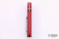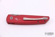This Harkins ATAC by Pro-Tech Knives was designed by Jeff Harkins. The auto fire feature is achieved by depressing the lower corner of the first (closest to front of the handle) black linen micarta inlay. Manual opening is equally effective, and with dual thumbstuds can be accomplished with either hand. Closes via the linerlock. Has a red aluminum handle, black linen micarta inlays and a bead blasted blade. Has a tip up orange peel finished titanium clip with hidden screws. Comes with Pro-Tech box and papers. Excellent condition.