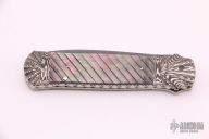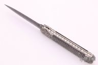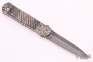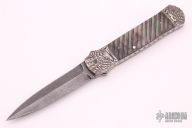 This Palm Release Auto by Ken Steigerwalt features a Damascus dagger blade with false top edge. The handle has scalloped and fluted Damascus bolsters, front and rear, fluted black lip pearl scales, fileworked nickel silver liners, fileworked stainless steel backspacer. Nice action and blade seating. Comes with a zippered case. Excellent condition.