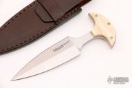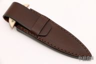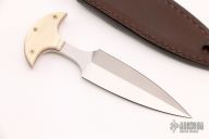 We have made This A.G. Russell Shopmade push dagger letter openers with both giraffe bone scales. Push Daggers were highly favored by gamblers on the early riverboats and in the gold fields of California and Nevada, where they were carried concealed, usually along with a derringer, as protection. Ours was designed for a much less adventurous life. Along with the elegant, deep chocolate brown leather sheath, you’ll not find a letter opener that will generate more interest. The knives are made in our own shop here in Rogers, Arkansas and are marked A.G. Russell™ Shopmade®. The blades are 154CM at 57-59 Rc. The giraffe bone scales are held in place by mosaic pins and red liners. The leather desktop sheath is made offshore to our design. Comes with original box. Excellent condition.