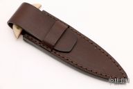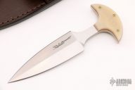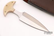 We have made This A.G. Russell Shopmade push dagger letter openers with both giraffe bone scales. Push Daggers were highly favored by gamblers on the early riverboats and in the gold fields of California and Nevada, where they were carried concealed, usually along with a derringer, as protection. Ours was designed for a much less adventurous life. Along with the elegant, deep chocolate brown leather sheath, you’ll not find a letter opener that will generate more interest. The knives are made in our own shop here in Rogers, Arkansas and are marked A.G. Russell™ Shopmade®. The blades are 154CM at 57-59 Rc. The giraffe bone scales are held in place by mosaic pins and red liners. The leather desktop sheath is made offshore to our design. Comes with original box. Excellent condition.