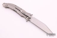 This assisted opening Expendables flipper by Darrel Ralph features a hand rub satin finished tanto blade. The handle is satin finished titanium with a reversible stainless steel clip with cross pendant and titanium barrel spacers. Comes with a nylon zippered case. Back of blade reads "THE EXPENDABLES". Excellent condition.