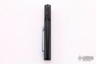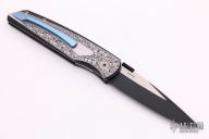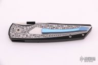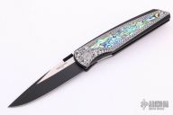 The frame is 416 stainless steel with 2-tone DLC black and hand satin finish, presentation grade abalone inlays on front, full hand engraving by master engraver Bruce Shaw, blue anodized 3d titanium clip, 2-tone DLC black and satin blade.  Includes the original box.  Excellent Condition.