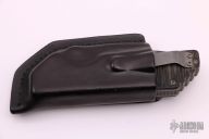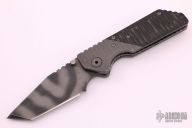 This GB from Strider Knives is a TAD Gear edition and #013, this is a very early one. It features a tiger striped tanto blade with dual thumbstuds and notched thumbrest. The handle has textured and bead blasted titanium bolsters, textured black linen micarta scales, titanium liners, tip up bead blasted titanium pocket clip, notched and checkered titanium backspacer. Nice blade seating, detent and lock up. Has some scratches and scuffs, otherwise good condition. Comes with a black Lifters Leather sheath.