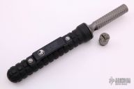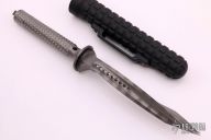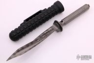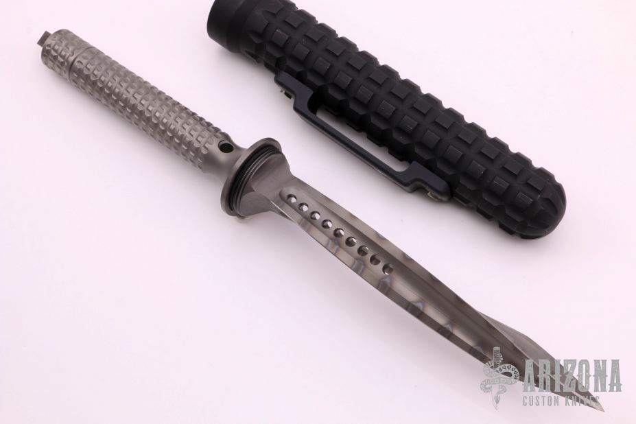 This Jagdkommando by Microtech knife features a flamed titanium blade and handle. This knife is an integral with hollow handle, butt cap is removable. Comes with black aluminum scabbard. Serial Number 00625 and dated 02/2015. Has some scuffs, otherwise excellent condition.