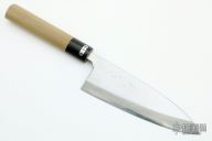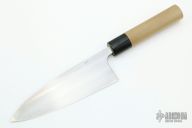 This Deba from Shinichi Watanabe features a stainless clad blue steel blade with a hidden tang construction. .260" Blade Stock. 2.08" Blade Depth. The handle features horn hilt nicely complemented by a Ho wood grip. This is a fantastic piece that is razor sharp. New from Maker.