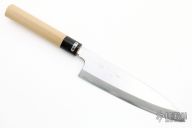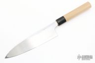 This Deba from Shinichi Watanabe features a stainless clad blue steel blade with a hidden tang construction. .214" Blade Stock. 1.198" Blade Depth. The handle features horn hilt nicely complemented by a Ho wood grip. This is a fantastic piece that is razor sharp. New from Maker.