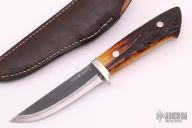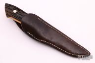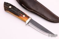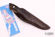 This sheath knife by Shosui Takeda features a Stainless Clad Aogami Super Steel (NAS) blade, .135" blade stock and 1.055" blade depth, hidden tang construction. The handle has nickel silver guard, and a 2-piece stag grip with nickel silver pins. Comes with a brown leather sheath. Handle by Moriya. New from maker.