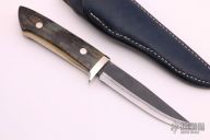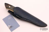 This sheath knife by Shosui Takeda features a Stainless Clad Aogami Super Steel (NAS) blade, .130" blade stock and 1.005" blade depth, hidden tang construction. The handle has nickel silver guard, and a 2-piece mammoth ivory grip with nickel silver pins. Comes with a blue leather sheath. Handle by Moriya. New from maker.