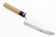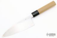 This Deba from Shinichi Watanabe features a stainless clad blue steel blade with a hidden tang construction. .234" Blade Stock. 1.976" Blade Depth. The handle features horn hilt nicely complemented by a Ho wood grip. This is a fantastic piece that is razor sharp. New from Maker.