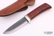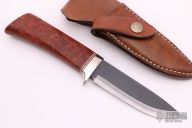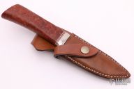 This sheath knife by Shosui Takeda features a Stainless Clad Aogami Super Steel (NAS) blade, .137" blade stock and 1.166" blade depth, hidden tang construction. The handle has nickel silver guard, and a wood grip with red/white/black spacers. Comes with a brown leather sheath. Handle by Moriya. New from maker.