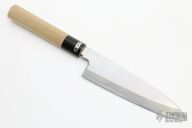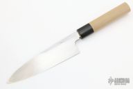 This Deba from Shinichi Watanabe features a stainless clad blue steel blade with a hidden tang construction. .193" Blade Stock. 1.75" Blade Depth. The handle features horn hilt nicely complemented by a Ho wood grip. This is a fantastic piece that is razor sharp. New from Maker.