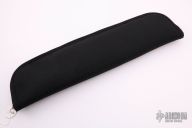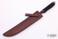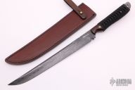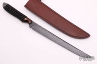 This custom fixed blade from Barry Dawson features a Damascus blade with fileworked spine and notched thumbrest, .198" blade stock and 1.147" blade depth, full tang construction. The handle is comprised of black paracord Japanese style wrap over ironwood scales with mosaic pins. Includes a zippered case. Comes with a brown leather sheath. Excellent condition.