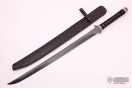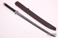This Wakizashi by Barry Dawson features a clear coated blade with nice hamon, .260" blade stock and 1.271" blade depth, full tang construction. The handle is comprised of black paracord Japanese style wrap over exotic wood scales. Includes a black leather sheath. Excellent condition.