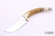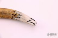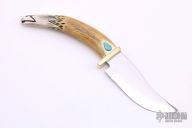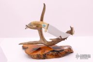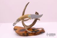 Cherokee Knife Maker, Ted Miller is an American Indian Artisan, of Miami-Peoria-Cherokee heritage. He has won over fifty significant awards. He carves images of his heritage and culture from stories passed down through his ancestors. Ted makes the handles for his knives from natural shed Deer and Elk Antler enhanced with semiprecious stones such as turquoise, coral, and onyx. Black handles are made from Buffalo horn. The blades for the knives are hand-shaped, sharpened, polished and heat-treated individually from 440C stainless steel, 56-60 Rockwell, and acid etched designs are worked on the larger blades . Stands shown are included in the price. All knives are shaped and balanced to provide a perfect grip for the sportsman as well as the ultimate in arts acquisition for the collector. Some handles may be similar in nature or design but each is an original piece with no two being exactly alike. Each knife is individually numbered and comes with a certificate of authenticity