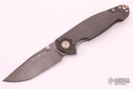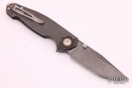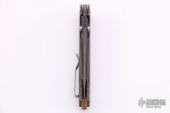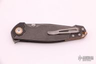 This Katla has a dark stonewashed and 3D milled titanium handle and a dark stonewashed blade. Has a copper backspacer and pivot collars.