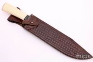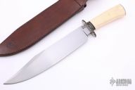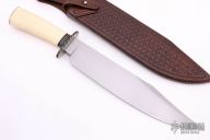 This Bowie by Master Smith John Fitch features a flat ground blade with a hand rubbed satin finish and sharpened clip, .264" blade stock and 2.164" blade depth, hidden tang construction. The handle has a fileworked nickle silver guard and fluted collar, walrus ivory grip and a nickel silver spacer butt plate. Comes with a beautiful hand tooled brown leather sheath with belt loop made by Morpheus Leathercraft. Has a few light scratches and very light and small oxidation spots, has a crack in the handle that has been stabilized, otherwise good condition.