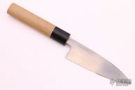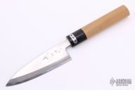 The Ajikiri 105 from Shinichi Watanabe features an iron clad white steel blade with a hidden tang construction. .140" Blade Stock. 1.243" Blade Depth. The handle features dark synthetic hilt nicely complemented by a HO wood grip. This is a fantastic piece that is razor sharp. New from Maker.