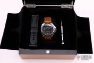 COMES WITH Original box papers, rubber band, outer cardboard box, tool. Sill has original tags and protective plastic on the back. Has chronometer testing and certification papers. This is basically a new Panerai. I know the consignor and he never wore it. New condition.