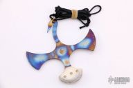 This Phoenix necklace by Elsa Fantino is made from anodized titanium with bone scales with brass pins. This can be removed quickly and used as a knuckle. Excellent condition.