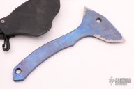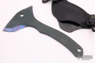 This Small Axe by Warren Thomas has a fingerprint anodized titanium blade with carbidized edge and green G-10 laminate, .279" blade stock. Comes with a kydex sheath. Has some scratches from the sheath, otherwise good condition.