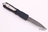 This Dirac by Marfione Custom Knives features a Vegas Forge Vines & Roses Damascus double-edged blade. The handle has anodized and hefted aluminum handle with ringed blue titanium hardware, tip down stainless steel clip. Comes with original box, zippered case and papers. COA dated 12/2019.  S/N 022. Excellent condition.
